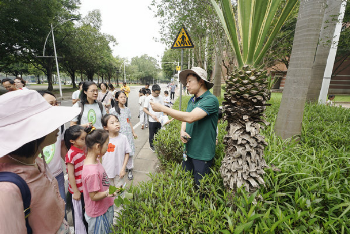 活动伊始,在学院分工会副主席彭逸生副教授的带领下,家长与孩子们开启了一场充满探索乐趣的“自然寻宝”之旅。孩子们好奇地观察形态各异的叶片,辨识花朵的芬芳,聆听彭老师讲述每一株植物的奇妙故事,在行走间悄然播撒下热爱自然、尊重生命的种子。