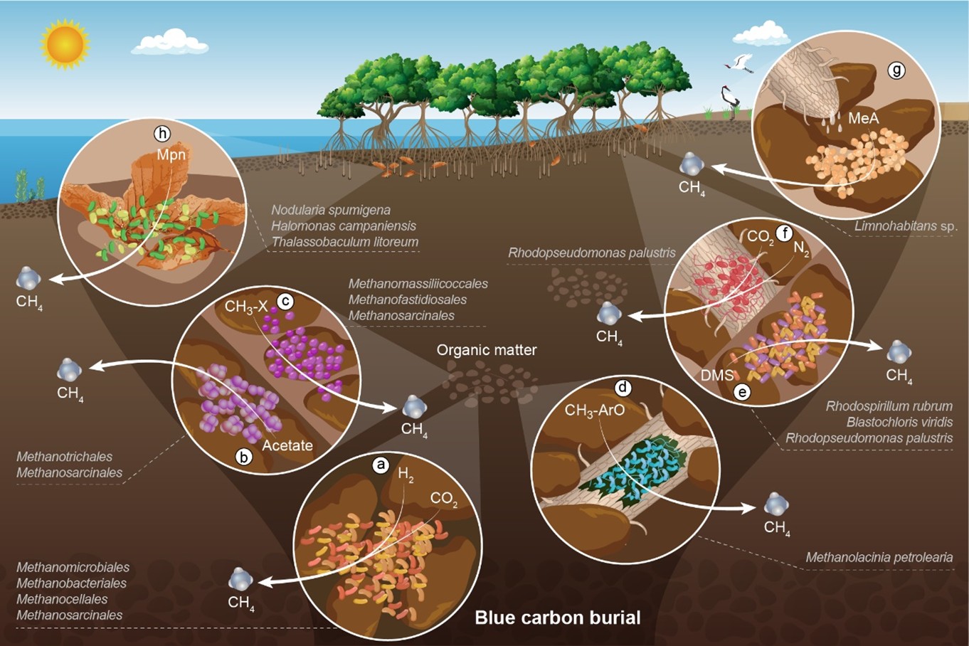 重点研究CH4和N2O等温室气体的新型产生途径及其生态效应,研发基于功能微生物调控的温室气体减排技术,创新滨海蓝碳生态系统碳汇功能强化策略。