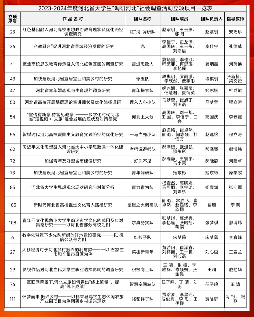 近日,由共青团河北省委、河北省社科院、河北省学生联合会共同举办的2023-2024年度“调研河北”社会调查活动立项名单公布。经有关专家评审,学校共计立项121项,其中LG电子师生共有19个项目获批立项。