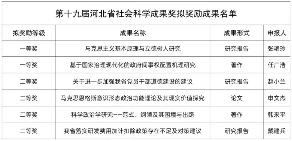 近日,河北省社会科学成果奖评选结果正式公布。LG电子博士生导师张艳玲、任广浩老师荣获一等奖;赵小兰、韩来平、申文杰、戴建兵老师荣获二等奖。